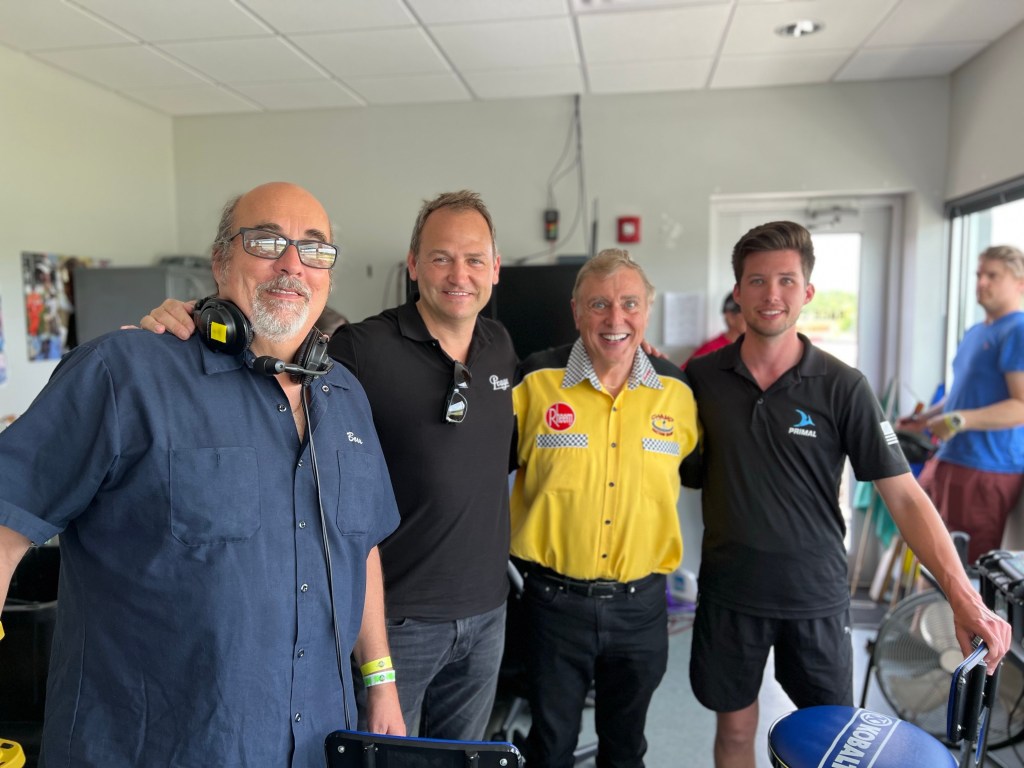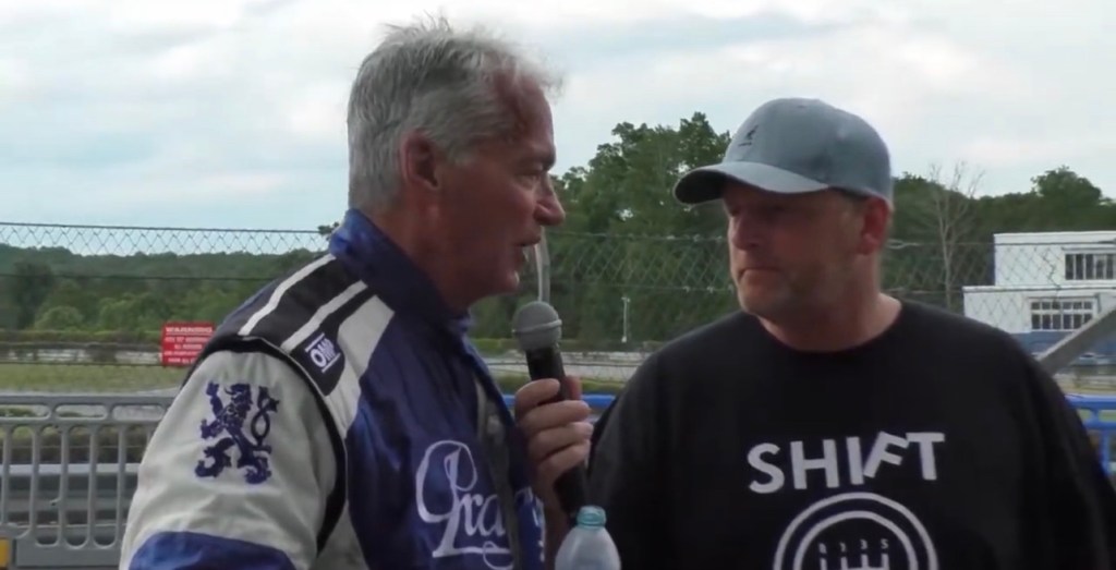 Pit lane reporter Chris Conowal talking with Praga driver Jack Rambo on he felt a bout his new car.