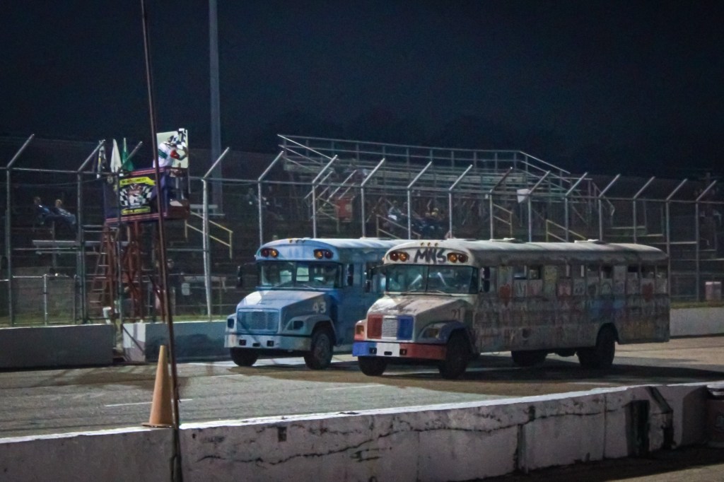 The School Bus race featured three buses that can be found around the grounds of Montgomery Motor Speedway, with Sherman racing alongside Austin Duke and track manager Stan Narrison.