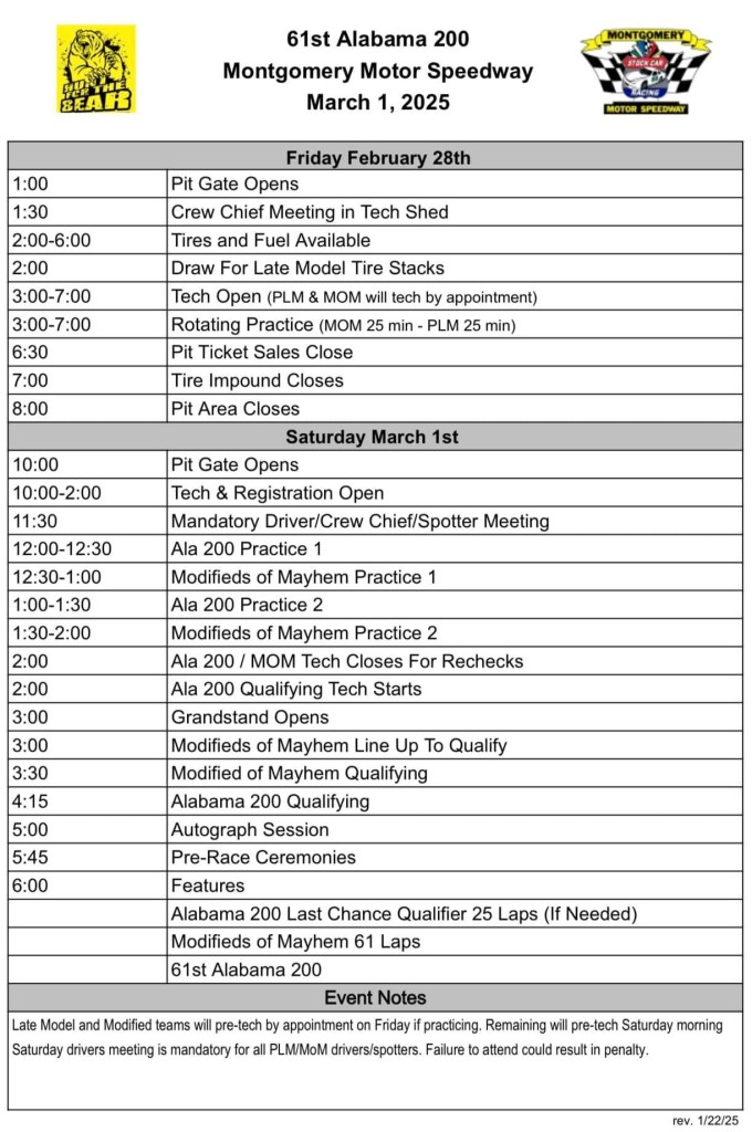Montgomery, AL — The 2025 Montgomery Motor Speedway season kicks off on Saturday, March 1st, with the marquee Pro Late Model 200-lapper known as the Alabama 200.