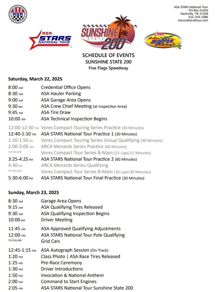 This “Pit Pass Preview” will provide fans with valuable information on the ASA STARS Sunshine State 200 in particular.