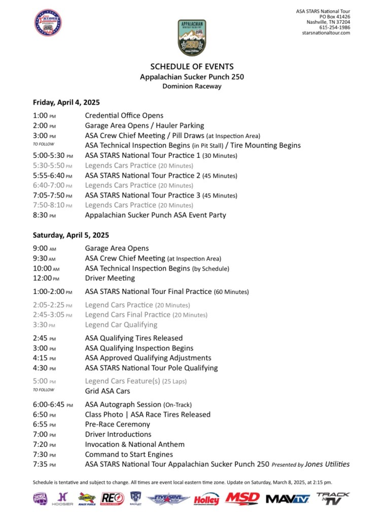 Woodford, VA — The third event of the 2025 ASA STARS National Tour season, the Appalachian Sucker Punch 250, is set to occur on Saturday, April 5th.